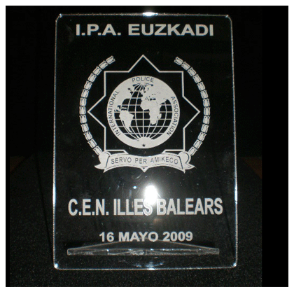 Placa grabada y recortada en metacrilato de 3 milimetros, con base triangular, realizada con Láser.